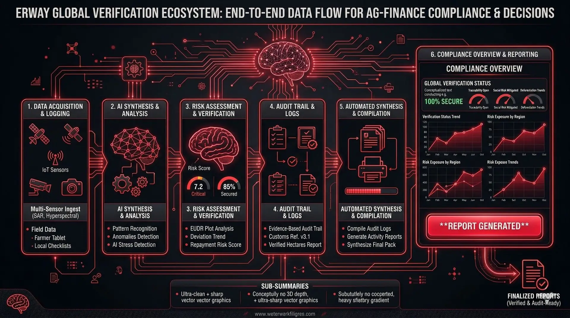 - The platform synthesizes satellite imagery and health logs into comprehensive evidence packs. These reports provide credit committees with an immutable “Single Source of Truth,” reducing the margin for error and eliminating the risks associated with manual reporting.