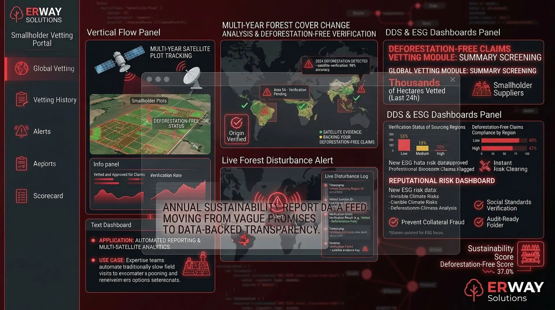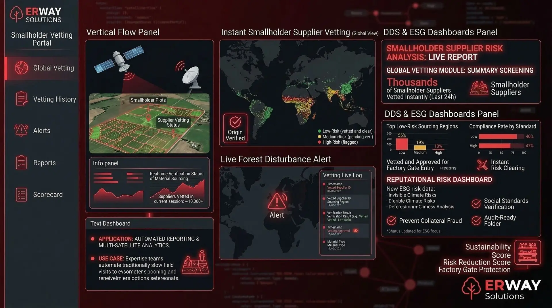 - Once the supply chain is established, we monitor production areas in real-time. If the system detects fire, illegal logging, or land-use changes on a supplier’s plot, it triggers an instant “Live Alarm,” allowing for immediate procurement adjustments.